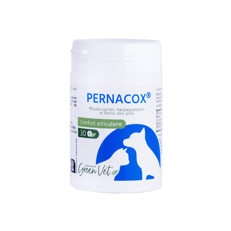PERNACOX est un aliment complémentaire à base d’extrait de mollusque, d’Harpagophytum et de Filipendula pour les articulations des chiens et chats.