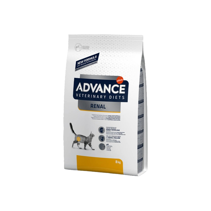 ADVANCE VETERINARY DIETS FELINE RENAL est un aliment diététique complet pour chat adulte, avec un niveau de protéines restreint mais de haute qualité et avec une faible teneur en phosphore, indiqué pour soutenir la fonction rénale en cas d'insuffisance rénale chronique ou temporaire.