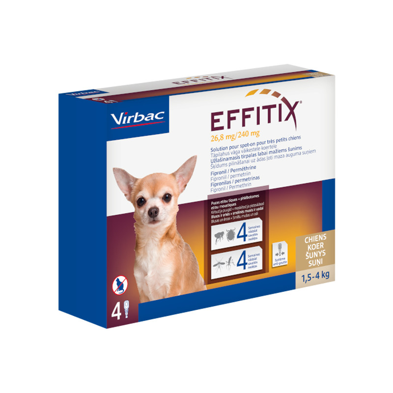EFFITIX spot on solution for Dogs contient les principes actifs Fipronil et Perméthrine qui contrôlent les infestations de tiques, puces, moustiques et phlébotomes.