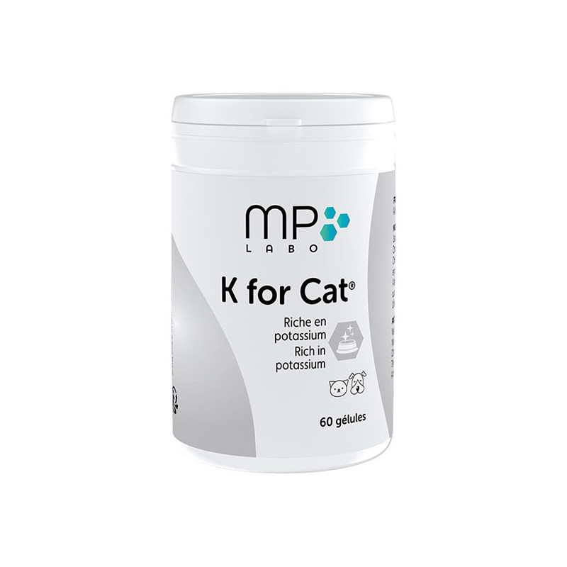 Le MP Labo K for Cat est un supplément de potassium destiné aux chats et aux chiens, disponible en boîtes de 60 gélules.