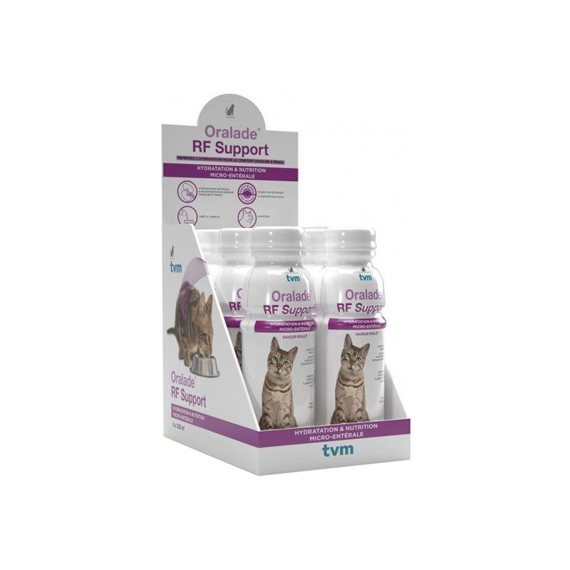 ORALADE RF Support est une solution isotonique, pauvre en phosphore, prête à l’emploi, appétente et hautement digestible pour encourager la prise de liquide et augmenter l’apport hydrique dans l’organisme.