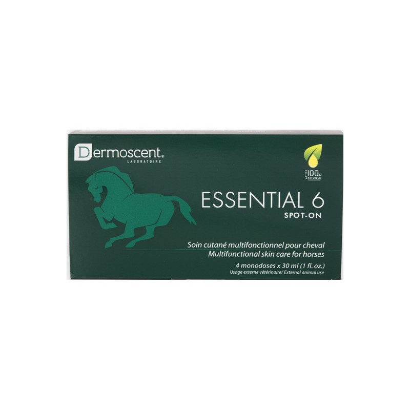 Essential 6 spot-on cheval hydrate la peau et aide à renforcer la fonction barrière cutanée tout en améliorant la brillance de la robe.